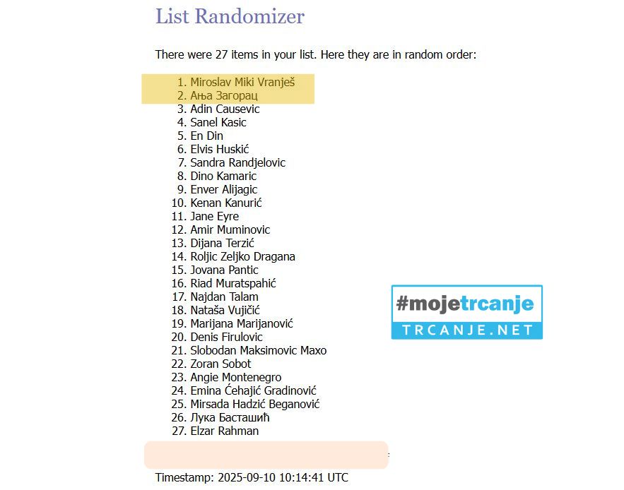 U nagradnoj igri Atletskog kluba Sana i Moje trčanje za dvije startnine za učešće na premijernom izdanju Sanske petice na programu 4. oktobra 2025. (od 12 sati), uslov za ulazak u konkurenciju je ispunilo 27 učesnika.