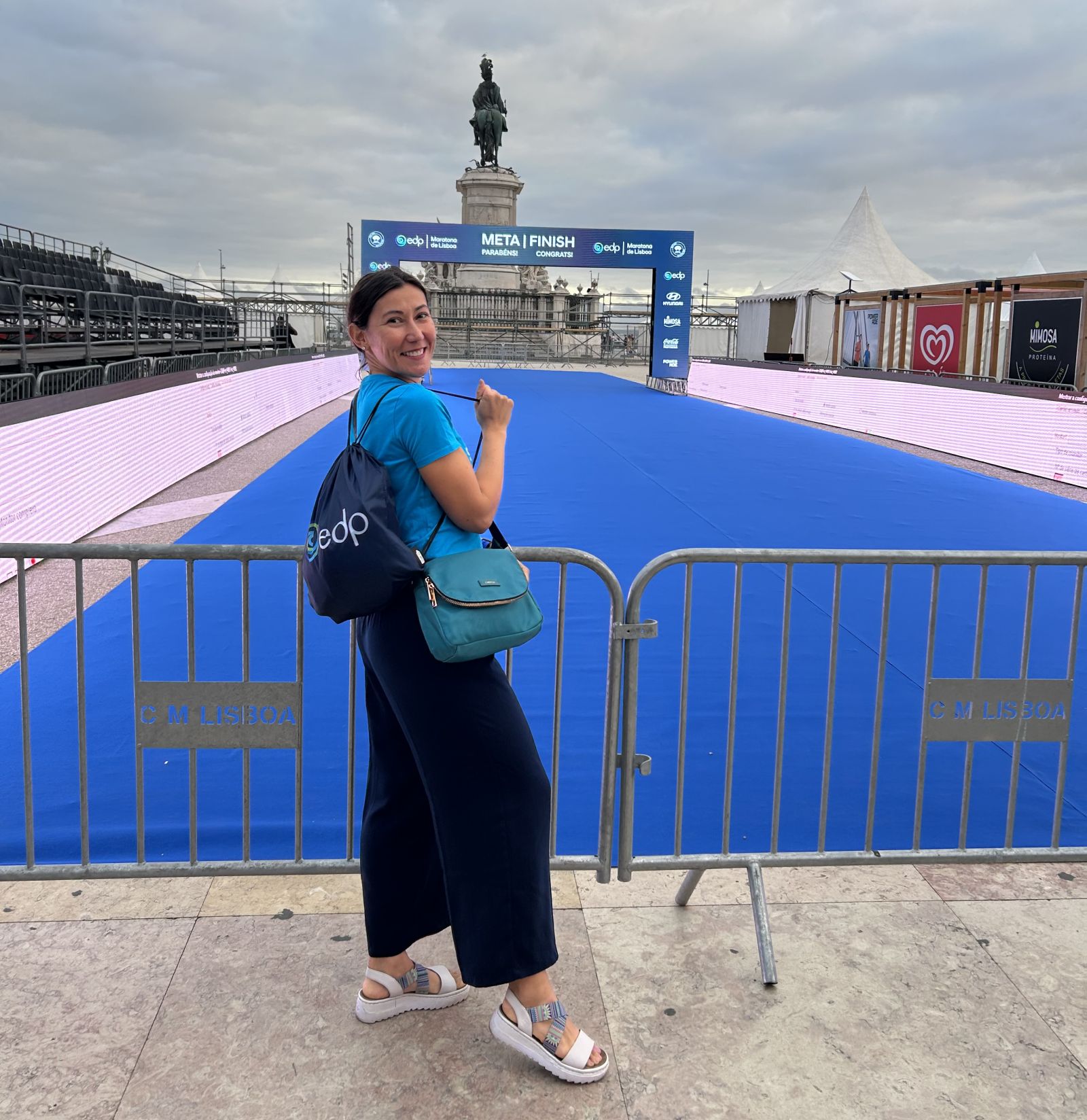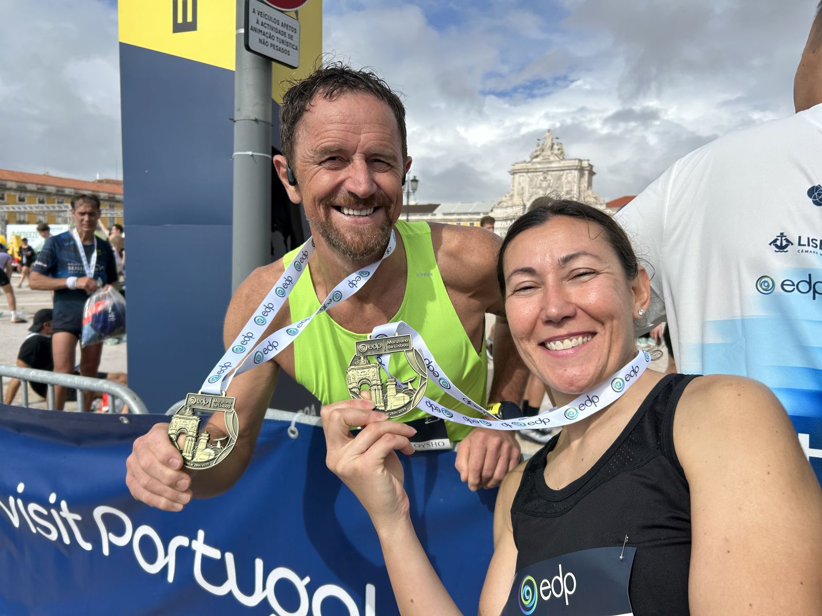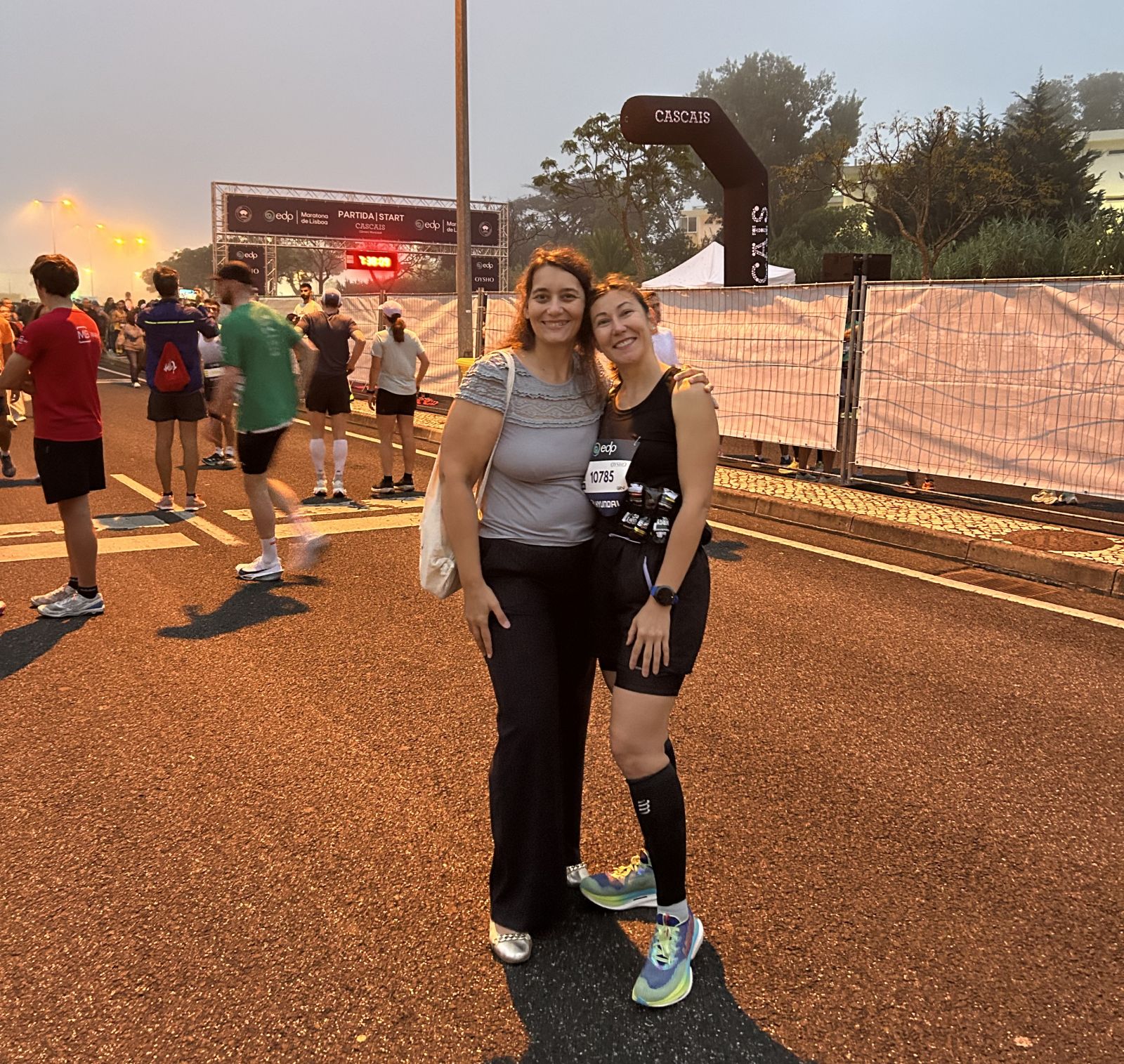 Let je bio noćni, sa presjedanjem, pa smo noć proveli na aerodromu. U Lisabon smo stigli sutradan oko podne. Smještaj smo odabrali prema mjestu starta trke, mjesto Oeiras (između Lisabona i Cascaisa). Poteškoće oko prevoza su nam oduzele malo vremena. Nismo jednom promašili prevoz pa izlazili odmah iz istog ili na pola puta. Sve te scene smo pretvarali u smijeh do suza. Nije nam to smetalo, jer smo tako zalazili u dijelove grada koje redovnim putem ne bi obišli. Sutradan odlazak u expo centar po brojeve. Kao svaki, prilično dobro opremljen, voće i kafu su dijelili gratis. Par slikanja i pokret u turistički obilazak da iskoristimo vrijeme do trke. Spavanje tih dana je bilo osrednje, ali hidratacija i carb loading na nivou (dijeta nam ne gine). Na dan trke prognozirano je oblačno vrijeme i kiša. Bar to. Inače, prilično visoka temperatura i stepen vlage za naše navike. Stigli smo na start kad jos nije bilo svanulo. Trkača je bilo oko 15.000. Muzika, adrenalin i nervoza, sve je samo raslo. Prema planu, prvi dio trke sam trebala ići rezervisano jer je brdovito, a kasnije da ubrzam. Ipak, startam malo brže i kalkulišem u glavi, ok može i tako, samo da održim taj tempo do kraja. Ubrzo je krenula kiša, prilično jaka. Bolje i to nego sunce. Kiša nas je pratila do nekog 12-13 km. Međutim, cesta je bila klizava i nisam imala željeni odraz. Brda sam savladavala prilično dobro, a i balansirala bih to nizbrdo. Linije na cesti koje razdvajaju trake su mi se učinile boljom podlogom, pa sam gazila preko njih što sam više mogla. Gelove sam redovno uzimala prema planu, kao i svaku okrepu.