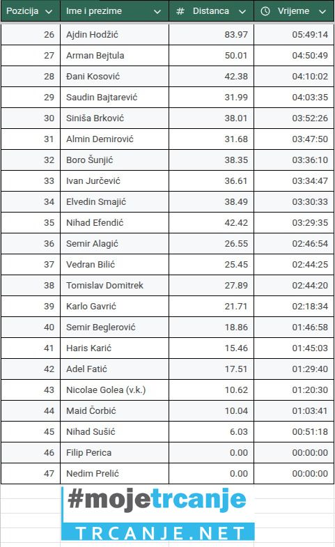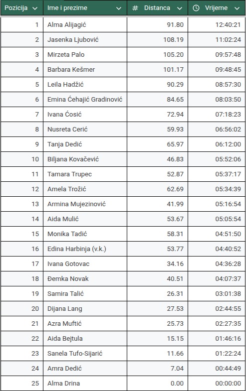 Naša tabela ovaj put nudi podjelu na muško/žensku kategoriju. Jednostavnija je jer nema kolonu iz ljetnog izazova „vrijeme sa bonusom“. Tako pored imena učesnika imamo pređenu distancu i vrijeme – prema kojem se određuje poredak.
