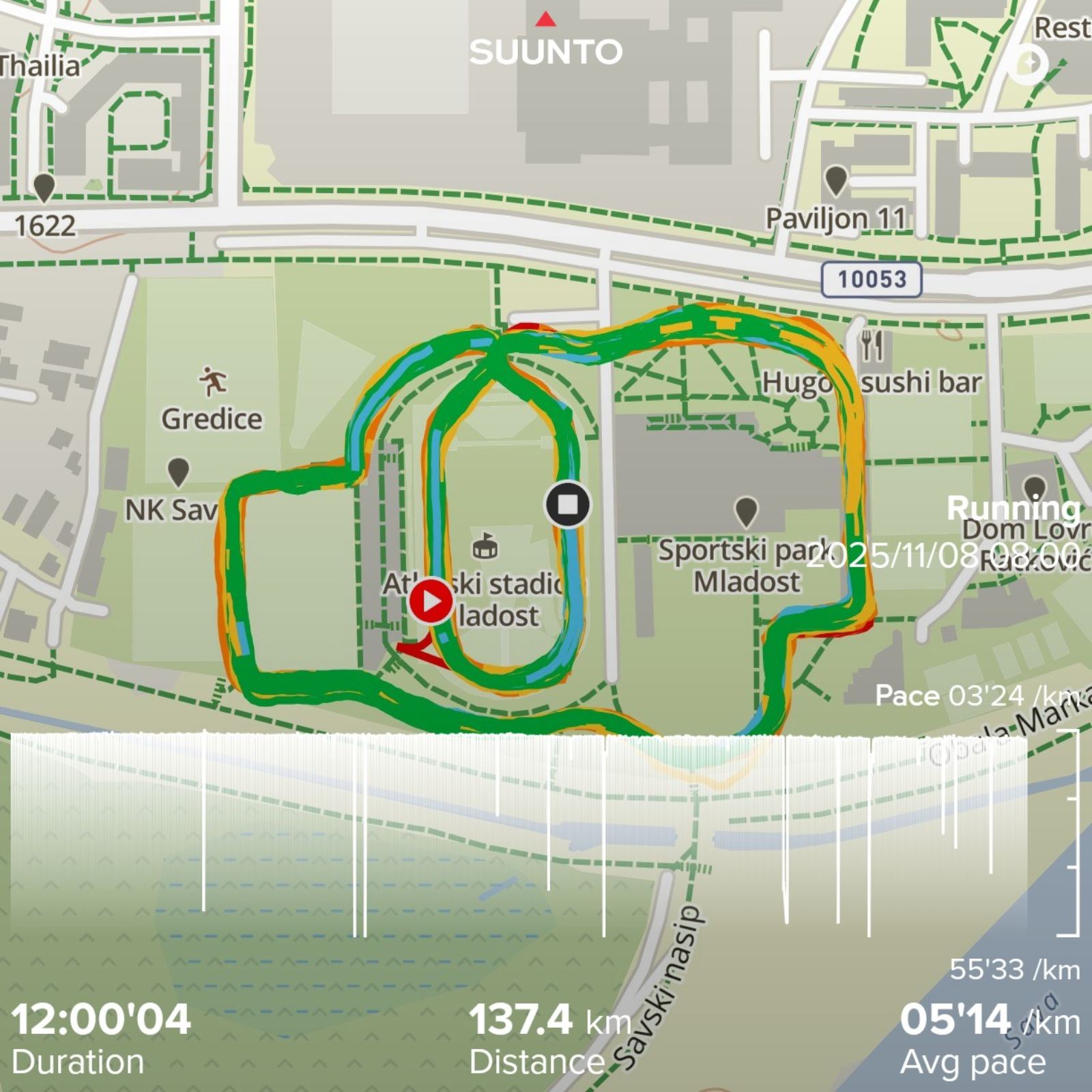 Kako su sati prolazili, tempo je postepeno padao — u rasponu od 5:20 do 6:02 min/km, što je bilo u granicama očekivanog.