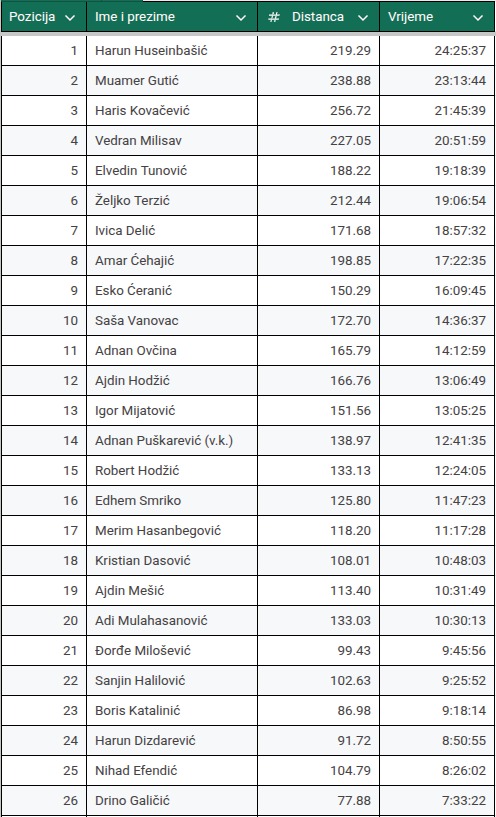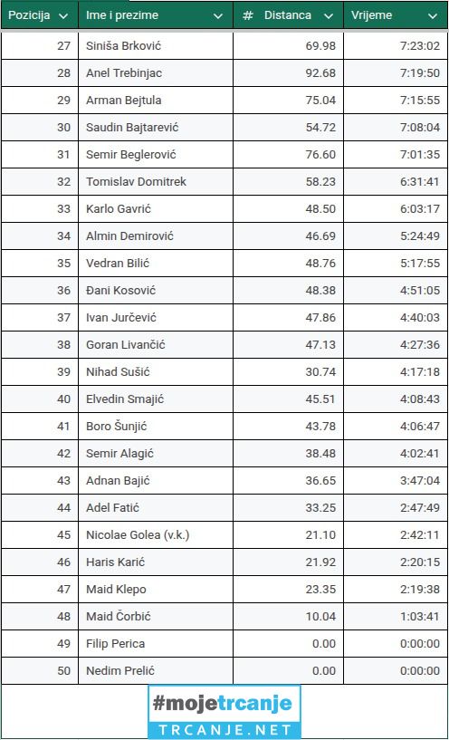 U odnosu na 72 učesnika u prvoj tabeli, broj se proteklih dana uvećao na njih 76 (50 u muškoj i 26 u ženskoj konkurenciji). Mnogi od njih će probati ispuniti izazov od 33+ sati trčanja koliko je potrebno u 3 mjeseca da bi ušli u konkurenciju za jednu od nagrada.