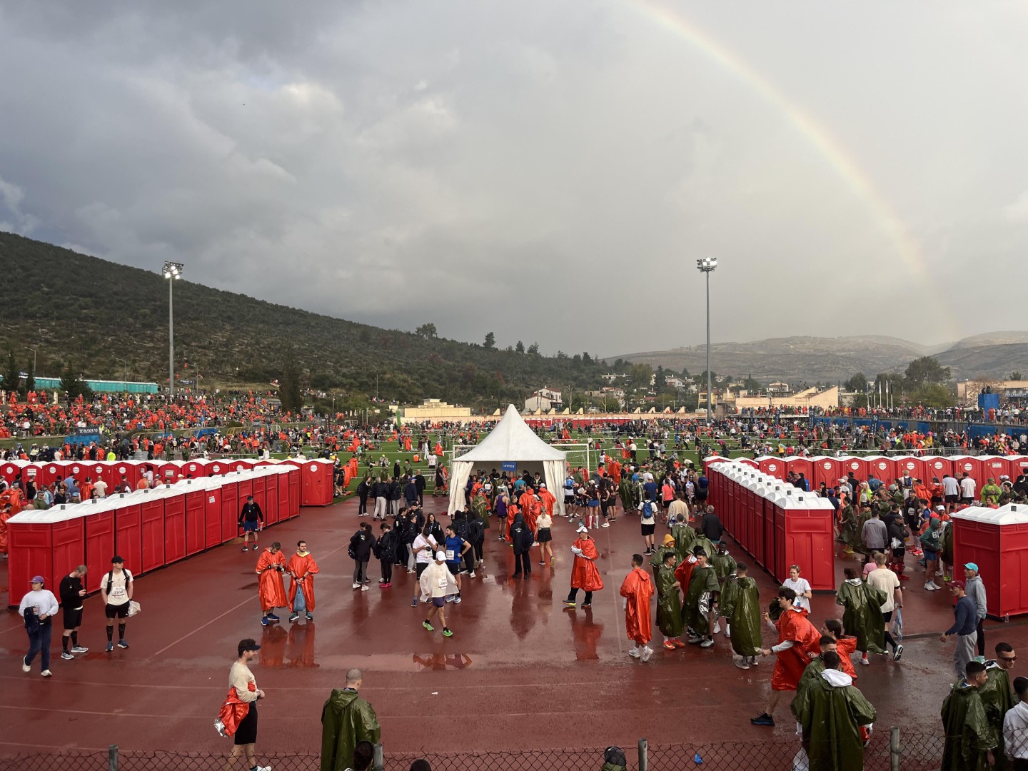 Kako se približavamo stadionu, u Maratonu vrijeme počinje da se mijenja i, na našu žalost, počinje padati kiša. Savjet: obavezno ponijeti kabanicu koju dobijete u startnom paketu. Mislim da je ona dovoljna da se može ugrijati i zaštititi od kiše. Ja sam ponio kabanicu i jaknu koji ću donirati u humanitarne svrhe prije starta. Ovo je novitet, jer nema više preuzimanja stvari od trkača na startu, stvari koje mislite obući poslije utrke se dostavljaju dan ranije na Expo. Izlazimo iz autobusa i krećemo prema startu. Tu se već počinje stvarati gužva jer autobusi pristižu jedan za drugim. Prijevoz trkača do starta je vrlo ozbiljna i zahtjevna operacija. Kako bi se prebacilo skoro 20.000 trkača, bilo je potrebno preko 300 autobusa. Kako prilazimo stadionu, počinju putokazi za svaki val od prvog do petnaestog. Ajdin i ja se tu pozdravljamo i razdvajamo.