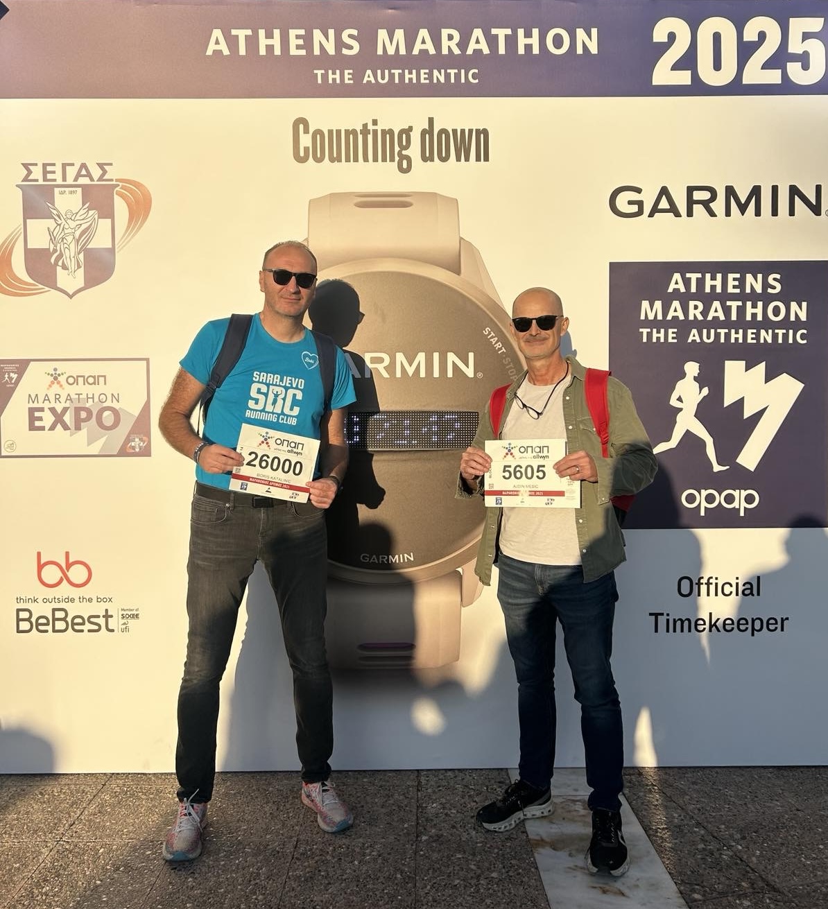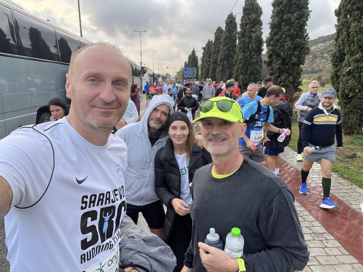 Petak 7. novembra ujutru nastavljamo putovanje prema Atini, u koju stižemo nešto malo prije 12 sati, pronalazimo smještaj, parkiramo auto i pravac Faliro olimpijski sportski kompleks, koji je malo udaljen od centra Atine. Za razliku od sarajevskog javnog prijevoza koji je nov, nepouzdan i skup, javni prevoz u Atini je održavan, pouzdan i jeftin (pojedinačna karta 1,2 eur trajanje karte 90 minuta, 5 dnevna karta 8,5 eura…), tako da nije bilo nikakvih problema sa dolaskom na Expo. Prema dogovoru, Ajdin i ja se nalazimo i krećemo po startne brojeve. Expo maratona je vrhunski organizovan i pripremljen. Sve, od ambijenta do ponude, je bilo odlično. Nema haosa, iako se očekuje preko 40.000 učesnika na svim utrkama. Brojeve smo uspjeli jako brzo podići, slijedi obilazak štandova. On je obavezan, jer je potrebno proći cijeli Expo, da biste preuzeli ruksak i majicu. Slijedi fotkanje ispred dvorane, a onda svi na zasluženi odmor.