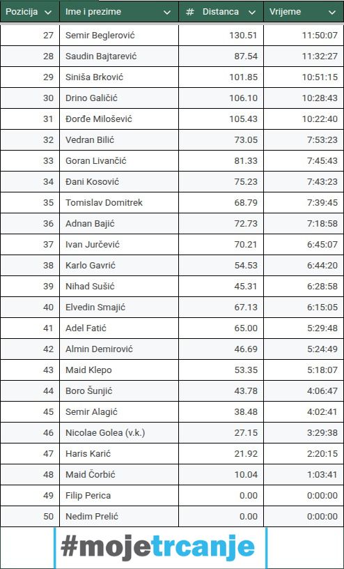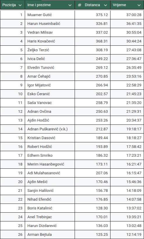 U obje tabele bilježimo promjene jer su svoje mjesto na vrhu izgradili Muamer Gutić i Jasenka Ljubović. Spomenuti Gutić i Harun Huseinbašić su već prešli prag od 33+ sati. Naših 76 učesnika su prošle sedmice kumulativno istrčali preko 3.300km.
