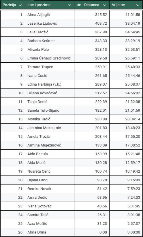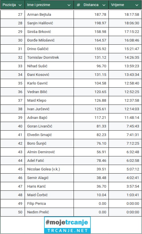 Svake sedmice imamo promjene na vrhu u ženskoj konkurenciji pa su opet pozicije zamijenile prva Alma Alijagić i druga Jasenka Ljubović (koja sa 403km ima najveću kilometražu). Prve četiri (plus Leila Hadžić i Barbara Kešmer) su već na 33+ sati i u svakom slučaju će učestvovati u izvlačenju za nagradni fond. U muškoj konkurenciji se Harun Huseinbašić već izdvojio sa skoro 64 sata trčanja u 37 dana. Drugi je i dalje Muamer Gutić. Kilometražom dominira četvrtoplasirani Haris Kovačević (571km). Vjerujemo da će MT izazov biti odlična trening baza i za ostale trkače iz vrha koji također odlično rade (Vedran Milisav, Igor Mijatović, Željko Terzić, Ivica Delić, Saša Vanovac, Elvedin Tunović, Adnan Ovčina…). U muškoj konkurenciji imamo deset trkača koji su ispunili kvotu od 33+ sati i bit će učesnici ždrijeba za nagradni fond (naravno, pod uslovom da i dalje – u trenutku izvlačenja – budu članovi Patreona).