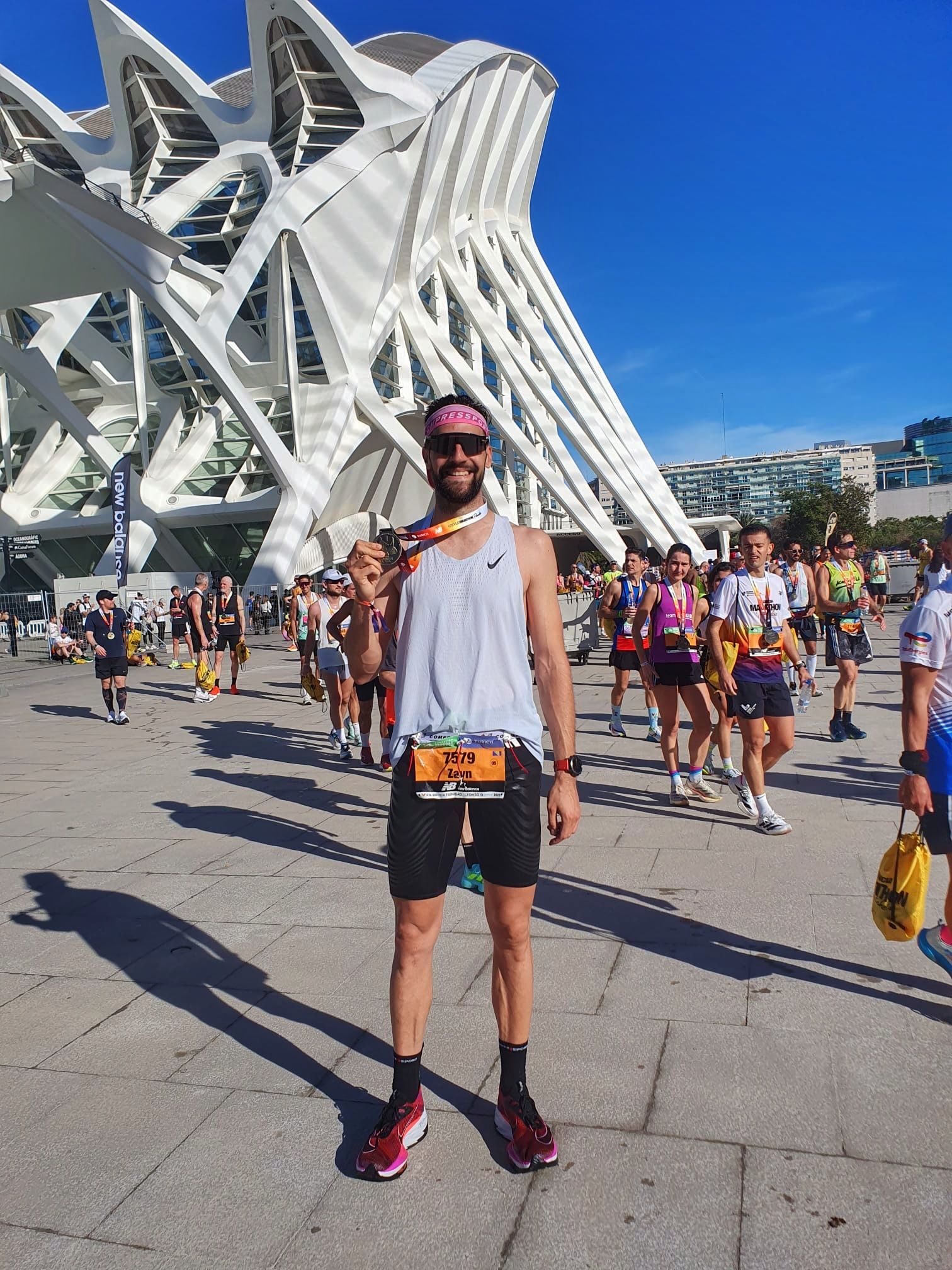 Na okrepnim stanicama sam kao i uvijek, koristio prvo okrepu profesionalnih trkača, koji nisu iskoristili svoje okrepe ili su ih promašili. Moje staro dobro razmišljanje, da ako je njima nešto korisno na tim okrepama, bit će i meni, me još nikad nije iznevjerilo. Tako da sam u toku trke popio i neke guste sokove od jagode, borovnice, nekad bi to samo bila voda ili gel razrjeđen u vodi. Nakon toga sam koristio „normalnu“ okrepu koja se sastojala od vode i powerade izotonika. Na kilometrima 18.7, 23, 28.3 i 37.1 sam popio po jedan gel, tik pred okrepne stanice s vodom. Bio sam u dillemi da li da uzmem još jedan gel na 33, ali nisam htio zbuniti stomak i to se pokazalo kao dobra odluka. Pred sami kraj trke je bilo već zaista vruće i vidio sam u više navrata kako mnogi trkači potpuno stanu. Također sam se bojao i izvrtanja zgloba (povreda od prošle godine u kombinaciji sa Alphafly tenama u kojima se osjećam kao na štiklama), tako da do zadnjeg momenta nisam htio da se opuštam i znao sam da ništa nije zagarantovano. Odbrojavao sam do finiša i računao u glavi za koji rezultat se borim, ali sam pogrešnim dodavanjem minute mislio da se na kraju borim na 2:52:59. Na ulasku u posljednjih 400m, silaskom pored magičnih Ciutat de les Arts i les Ciences, na satu sam ugledao već visokih 2:52 pa sam shvatio da to neće biti 2:52 nego da imam 2:53. Dalje sam nastavio jako ali nisam htio da sprintam najvećom mogućom brzinom da ne bih izvrnuo zglob. Tek u tim trenucima sam shvatio da se borim za sub 2:54, koji mi je u tim trenucima postao imperativ i uključio sam DRS i u nekom maksimalno kontrolisanom sprintu prešao ciljnu liniju za 2:53:55. Wow! Nisam mogao sebi doći, prvo sam kao i obično legao u cilju ali onda nakon pokušaja intervencije volontera i hitne pomoći, vrlo brzo objašnjavam kako je sve ok i da mi samo treba minuta, na što mi oni objasne da nemam toliko vremena jer je ovo cilj Valencia Maratona. Vrlo brzo ustajem, idem do prvog trkača koji ima mobitel sa sobom i zamolim ga da pogleda na aplikaciji da li sam zaista dobro sve ovo shvatio i da mi nije pobjegla neka sekunda. I da, Demir Hadžimuratović 2:53:55 – Valencia Maraton 2025.