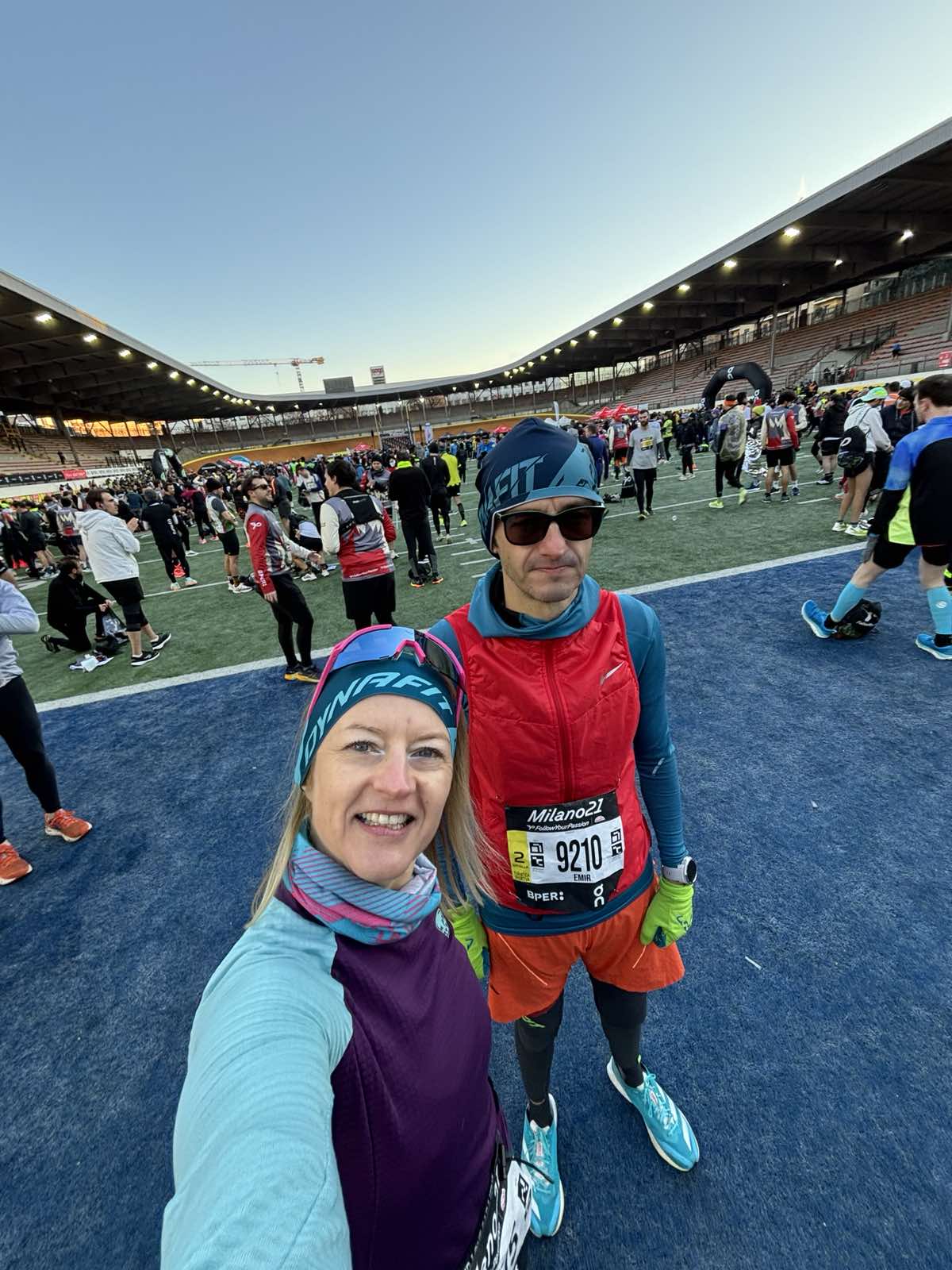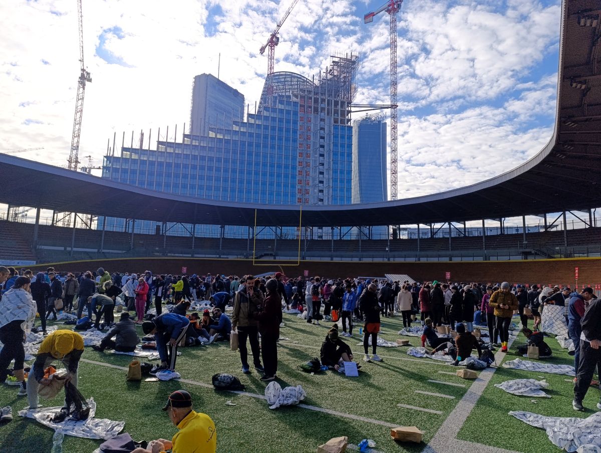 Ustali smo na vrijeme te banuli na doručak i prije zvaničnog otvaranja hotelskog buffet-a. Popili smo espresso uz nešto slatkog, pokupili po bananu i krenuli na start. Pripremio sam sebi sodu bikarbonu koju sam popio u toku vožnje metroom. I ranije sam pred neke trke isprobao taj napitak, smatram da ima pozitivnog efekta s tim da se zaista treba iskapiti bar 60 minuta prije starta. U metrou/vozu smo proveli skoro sat vremena, moralo se i presjedati, ali smo pratili brojne trkače koji su krenuli na trku tako da nije bilo gubljenja. Start je bio u sjeverozapadnom dijelu grada, gdje je puno impozantnih zgrada i to je sajamski dio Milana (Fiera). Ostavljanje opreme i toaleti su bili organizovani na impozantnom velodromu Vigorelli koji je zapravo omanji stadion gdje ispod tribina ide biciklistička staza/pista (drvena), a unutar nje je teren sa vještačkom travom ocrtan za američki fudbal (sa golovima za ovaj sport). To je zapravo bio idealan prostor za drop bag i kasniji pick up (tu je bilo i proglašenje pobjednika) gdje je sve sjajno osmišljeno i jasno numerisano, a svaki volonter je dužio cca 200 vrećica i išlo je jako brzo. Na toaletu sam čekao nešto duže od planiranog – iako je bilo puno kabina, bilo je i jako puno trkača kojim je trebalo pražnjenje pred trku. U blizini se nalazila startna zona gdje sam stigao na vrijeme, ali ne baš zagrijan kako treba. Po očekivanju je bilo veoma hladno, ali sunčano i bez nekog vjetra. Zauzeo sam svoje mjesto u drugom talasu (prijavio sam 1:45 očekivano vrijeme) i bio spreman za start, imao sam na sebi tajice (tanje) prsluk i rukavice, a ispod prsluka toplu usku majicu za trčanje u ronilačkom stilu (nešto kao Cathy Freeman na OI u Sidneyu, čak i slična boja). Kasnije će se ispostaviti da sam pogodio što se tiče izbora obuće i odjeće za trku mada sam bio među toplije odjevenim trkačima.