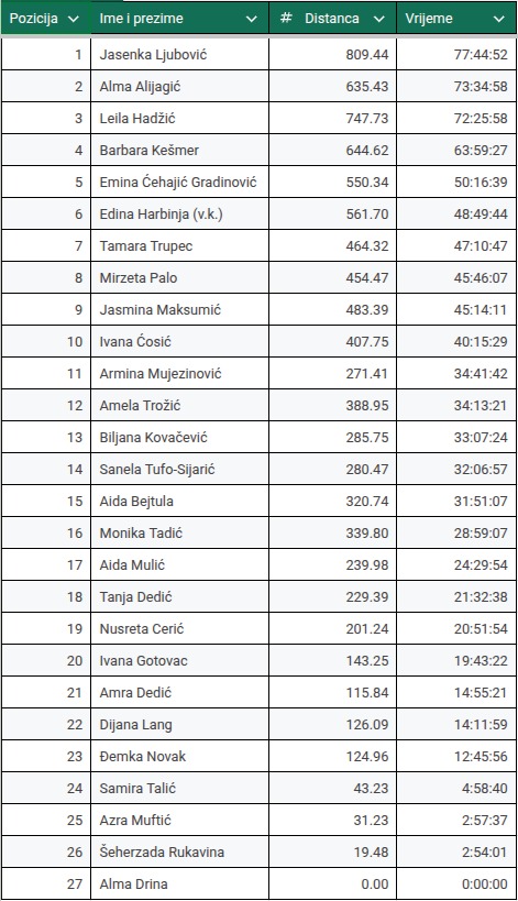 U ženskoj tabeli imamo promjenu na vrhu jer se Jasenka Ljubović nakon dugo vremena vratila na čelo, ispred Alme Alijagić koja je najduže bila vodeća. Vrlo blizu im je i Leila Hadžić. U vrhu se izdvajaju još i Barbara Kešmer, Emina Ćehajić Gradinović, Edina Harbinja, Tamara Trupec, Mirzeta Palo, Jasmina MaksumićTrinaest žena je već ispunilo normu od 33+ sati.