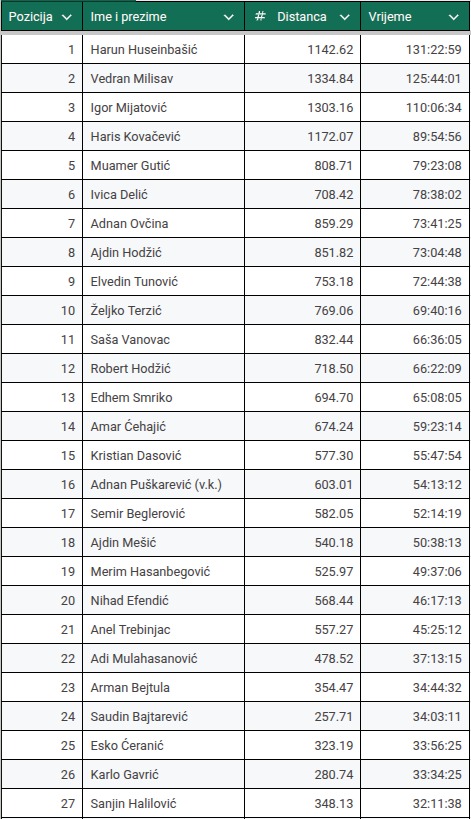 Broj učesnika se prošle sedmice uvećao na njih 77 (50 u muškoj i 27 u ženskoj konkurenciji) jer je izazovu pristupila i Šeherzada Rukavina. Mnogi od njih će probati i ispuniti izazov od 33+ sati trčanja koliko je potrebno u 3 mjeseca da bi ušli u konkurenciju za jednu od nagrada.