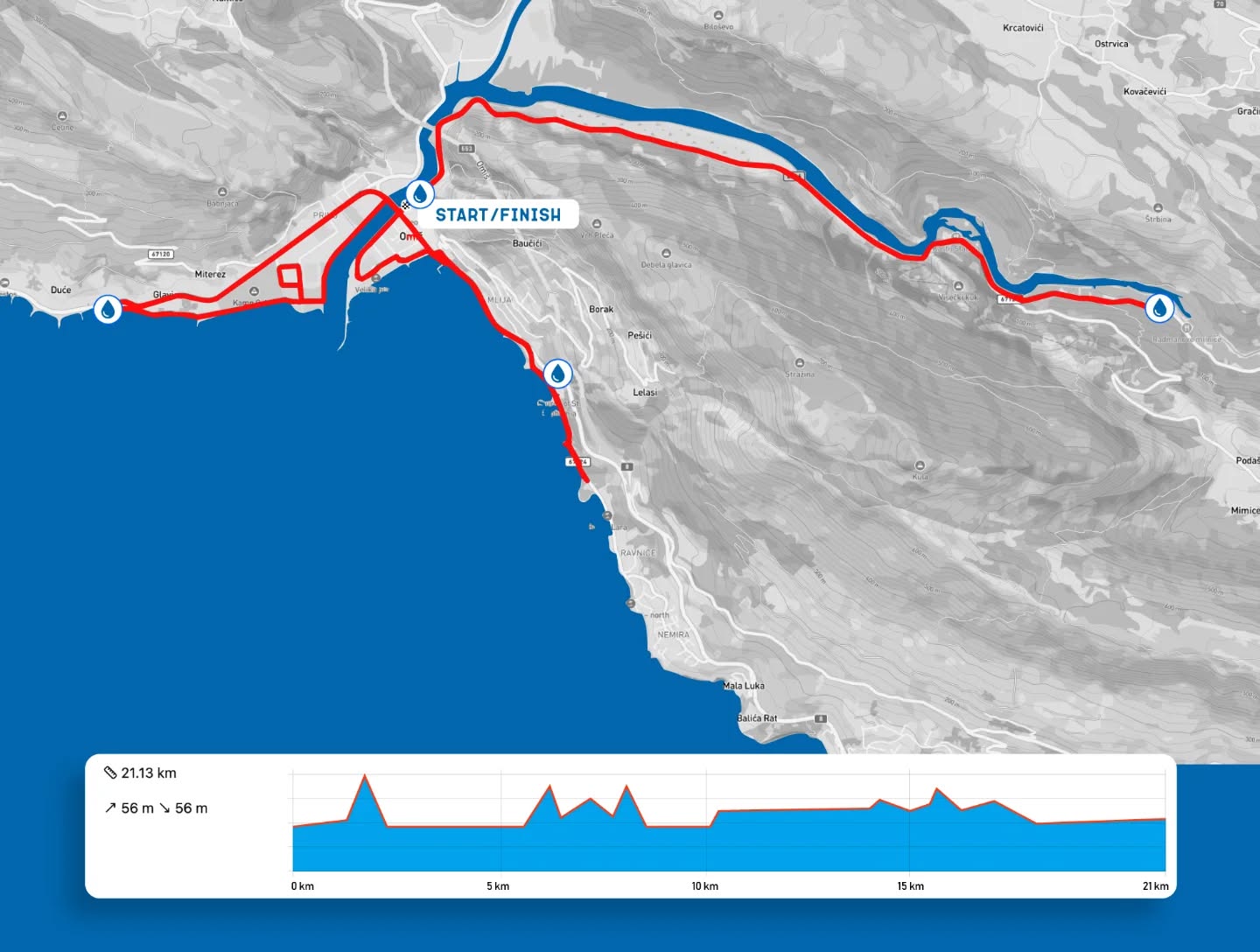 Kao što smo spomenuli, polumaratonska utrka se ove godine trči izmijenjenom stazom – trkači samo jednom ulaze u kanjon Cetine, umjesto dosadašnja dva puta, dok će ih ostatak trase voditi uz obalu i plaže, uz pogled koji oduzima dah na svakom koraku. Trasa prolazi kroz impresivne krajolike Omiša i okolice te spaja more, rijeku i prirodu u jedinstveno trkačko iskustvo.